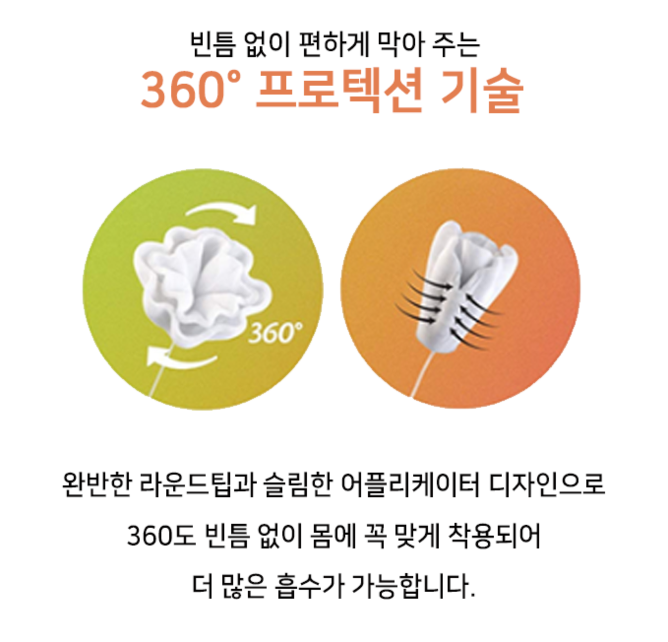 설명 와 같이 플레이텍스의 탐폰은 360도 펼쳐지는 기술로 샐 염려가 없습니다. 실제로도 작지만 이물감이 없는 크기와, 꽃봉오리처럼 펼쳐지는 기술력 때문에 정혈이 샐 염려가 없어 사람들이 많이 찾는 제품입니다.